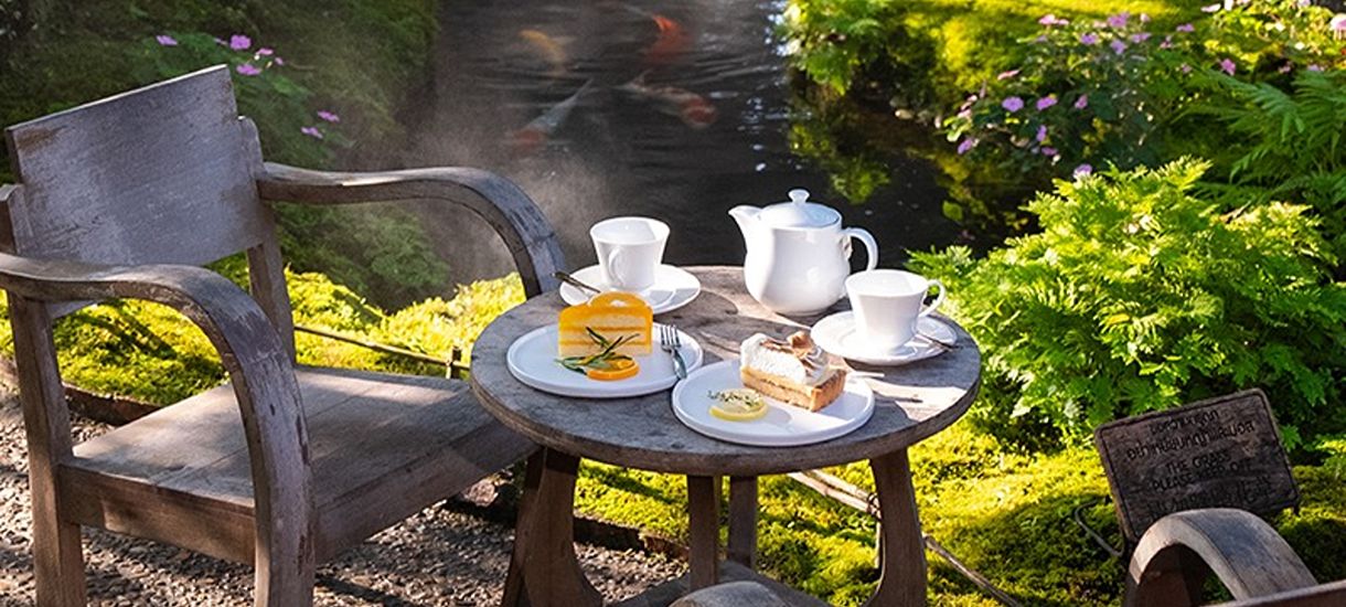 You can hang out indoors or wander out on the cobblestone path. That’s where things get even more special. There’s a misty garden full of blooming orchids, a pond of colorful Koi swimming around, and a stunning cascade flowing gently. Everything blends so beautifully, it just makes you want to slow down, breathe, and truly soak it all in.