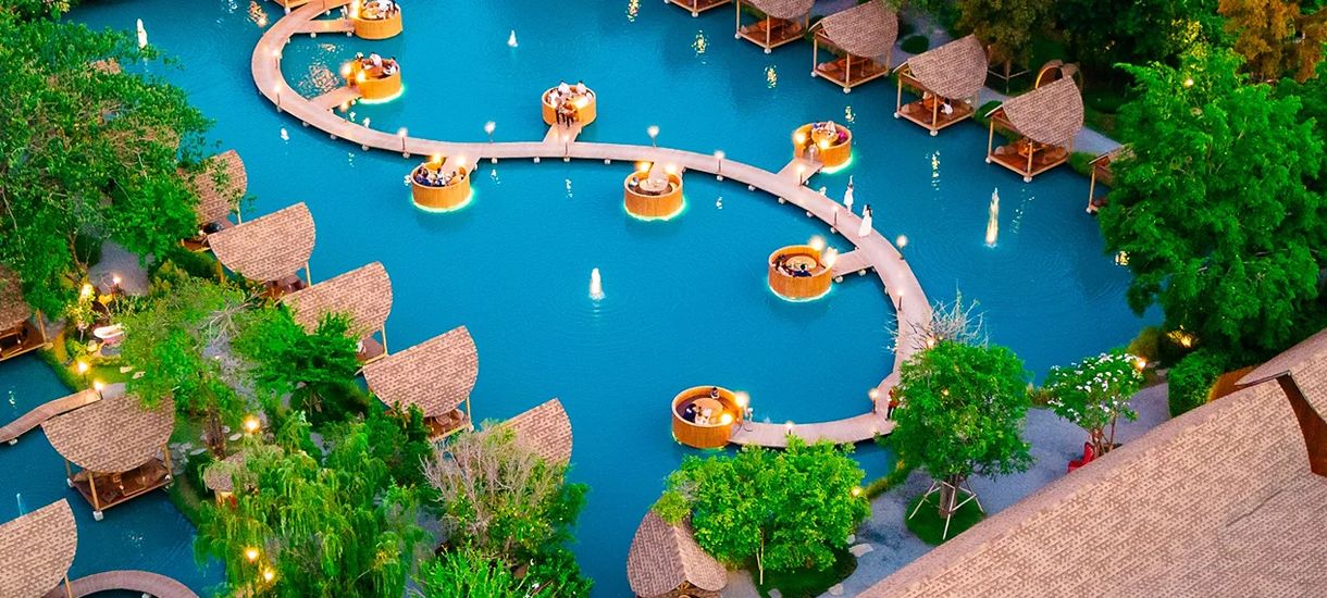 Thailand is home to cafés that look like they're tucked away in a little jungle, and at the same time, others that seem to float right out on the ocean. One of the most stunning examples? Bubble In The Forest, a Maldives-style cafe with over-water bungalows.